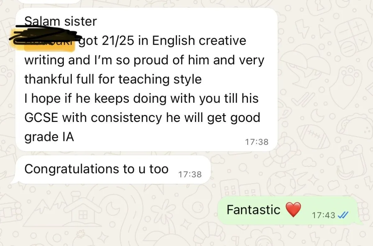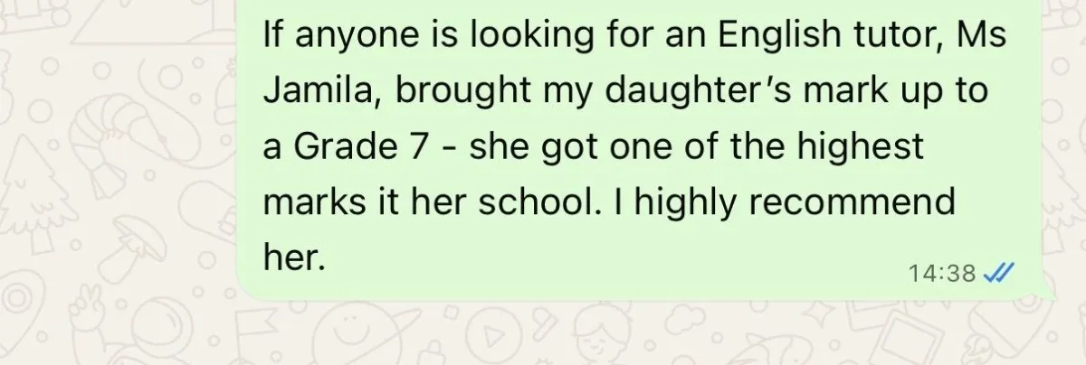 "Studying with Ms. Jamila has been an incredible experience. Her approach helped me understand English in a way I never had before. With her help, I earned a grade 8 in my exams. She is a caring and supportive tutor who always goes the extra mile."