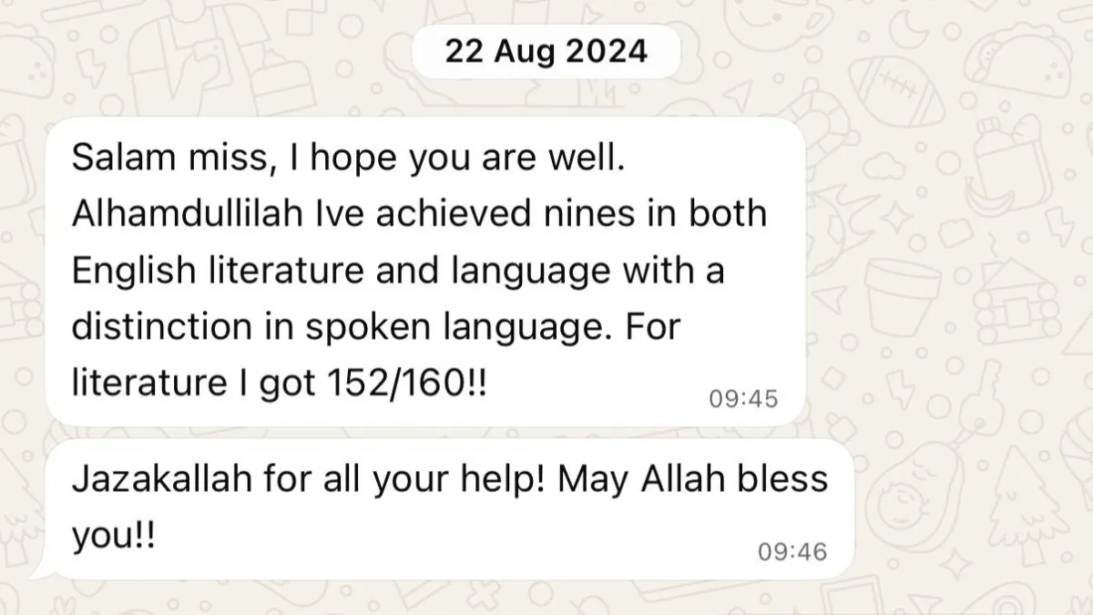 "We are so grateful to Ms. Jamila for her incredible approach to teaching English. Based on a recommendation, our daughter, Emily, went from struggling to achieving a grade 9 in her exams over the two years. Ms. Jamila taught her how to structure a response and exam techniques. I highly recommend.”